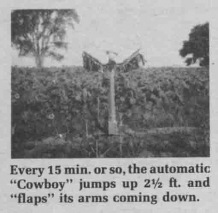 The Cowboy is a man-sized scarecrow attached to a propane-powered scare cannon that makes a boom when it goes off and sends the cowboy 30 in. up into the air. It twirls as it comes back down, so that streamers trailing from the arms of the cowboy flap in the wind, helping scare off birds. The unit is controlled by a 12-V battery. A solenoid closes off the scarecrow at night to conserve fuel.