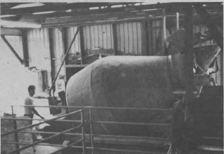"One disadvantage of using a concrete mixer over 'store-bought' mixers is that material can't be added to the mixer with a front-end loader. We overcame this problem by running a conveyor into the mixer. We dump into a hopper at the end of the conveyor with a front-end loader."