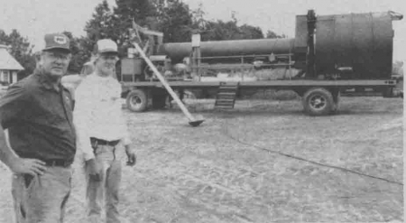 The LP-gas burner and blower, salvaged from a crop dryer, deliver 4.5 million btu's. "We drilled out the holes to boost the heat output," explains Todd. A 320 gal. propane tank mounted on the trailer holds enough fuel for about 10 hrs. of operation. A 77 hp irrigation generator provides power for the fan motor.