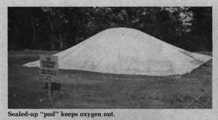 Here's how grain is sealed up in a Pod. First an area is cleared and leveled. Then earth berms, about 3 ft. high, are erected on 3 sides with a tractor loader or blade. A floor liner is then laid across the storage area and grain loaded onto that. Once grain is piled into place, the PVC cover is put over the top and sealed along the edges with a special chemical solution and a heat-sealing machine. Pods can be erected to any size and can be reused after grain is removed by simply slicing off about a 2-in. edge where the Pod is sealed. The PVC fabric has a 25-year life expectancy.
